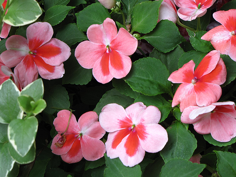 Patchwork™ Pink Shades Impatiens is blanketed in stunning shell pink round flowers with cherry red streaks at the ends of the stems from mid spring to late summer. Its small pointy leaves remain green in color throughout the season.