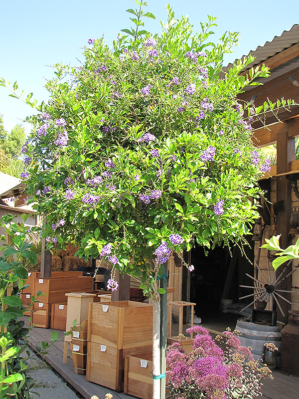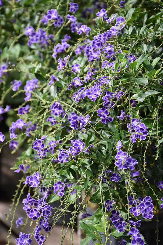 Sapphire Showers Duranta makes a fine choice for the outdoor landscape, but it is also well-suited for use in outdoor pots and containers. Its large size and upright habit of growth lend it for use as a solitary accent, or in a composition surrounded by smaller plants around the base and those that spill over the edges. It is even sizeable enough that it can be grown alone in a suitable container. Note that when grown in a container, it may not perform exactly as indicated on the tag - this is to be expected. Also note that when growing plants in outdoor containers and baskets, they may require more frequent waterings than they would in the yard or garden. Be aware that in our climate, this plant may be too tender to survive the winter if left outdoors in a container. Contact our experts for more information on how to protect it over the winter months.