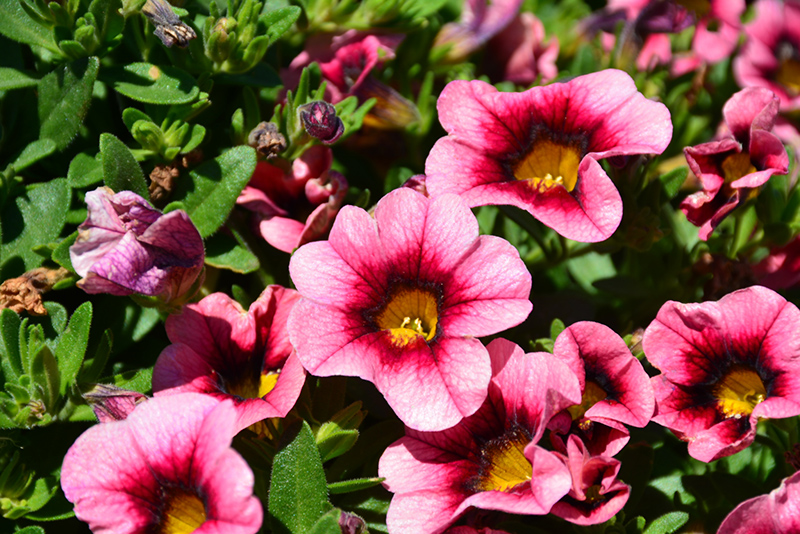 Hula Hot Pink Calibrachoa is draped in stunning pink trumpet-shaped flowers with yellow throats and hot pink centers at the ends of the stems from late spring to early fall. Its small pointy leaves remain green in color throughout the season.