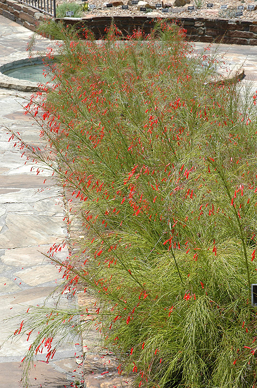 This sub-shrub is a weeping variety with very fine, grassy foliage, producing tall spikes of striking red-orange tubular flowers all season; prefers full sun and is drought tolerant once established; great for containers, and baskets; overwinter indoors