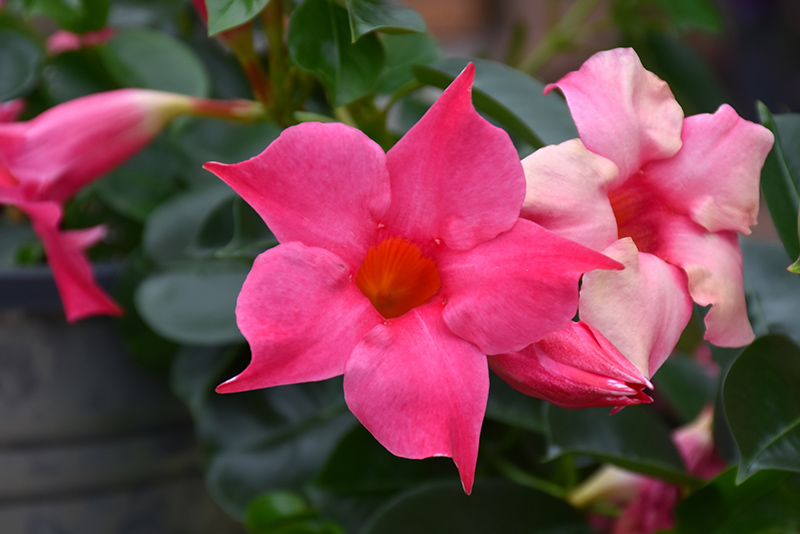 Pink Mandevilla features bold pink tubular flowers with yellow throats along the branches from late spring to mid fall. Its glossy pointy leaves remain dark green in color throughout the year.
