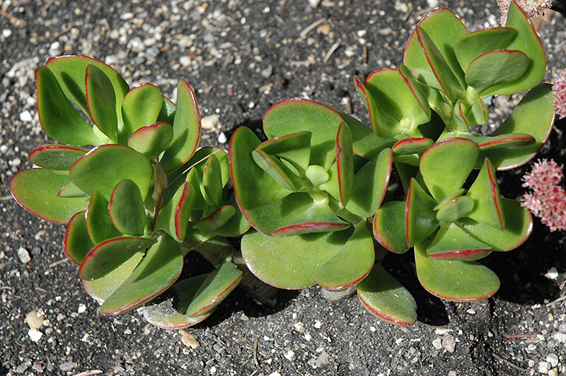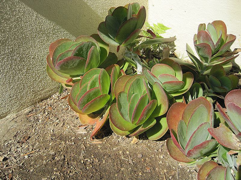 This variety is easily recognized by its paddle shaped leaves that are oppositely arranged and covered with a thick wax; full sun encourages red coloring; tall yellow flower stalks in late winter, when plant matures; great for containers and rock gardens