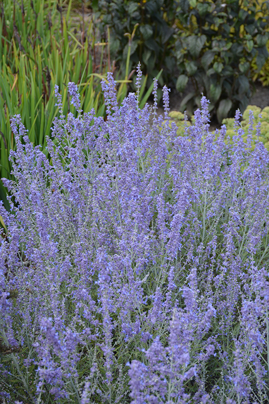 This compact variety forms a dense mound of fragrant gray-green leaves, producing multiple spikes of lavender blue flowers held in smoky purple calyxes from summer until fall; vigorous and early blooming; excellent for the garden or mixed containers