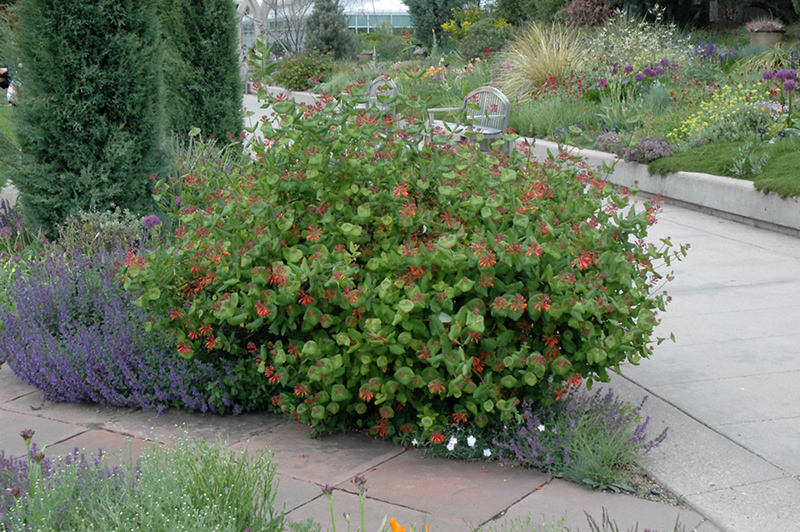 Dropmore Scarlet Trumpet Honeysuckle is a multi-stemmed deciduous woody vine with a twining and trailing habit of growth. Its relatively coarse texture can be used to stand it apart from other landscape plants with finer foliage.
