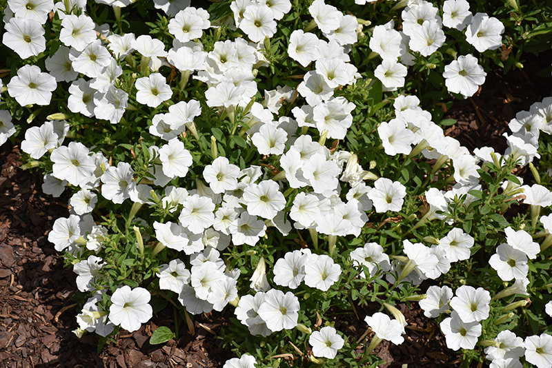 Supertunia Vista® Snowdrift™ Petunia will grow to be about 24 inches tall at maturity, with a spread of 3 feet. When grown in masses or used as a bedding plant, individual plants should be spaced approximately 20 inches apart. Its foliage tends to remain dense right to the ground, not requiring facer plants in front. This fast-growing annual will normally live for one full growing season, needing replacement the following year.