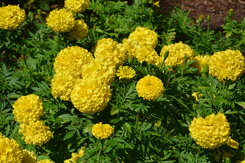 Marvel II™ Yellow Marigold features bold double yellow ball-shaped flowers at the ends of the stems from late spring to mid fall. The flowers are excellent for cutting. Its fragrant ferny leaves remain dark green in color throughout the season.