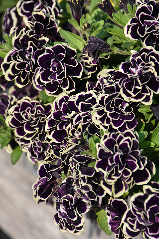 Beautiful double blooms in deep purple with golden-cream edging flower profusely on this well branched, spreading variety; a stunning specimen when trailing from hanging baskets and patio containers; low maintenance; attracts pollinators