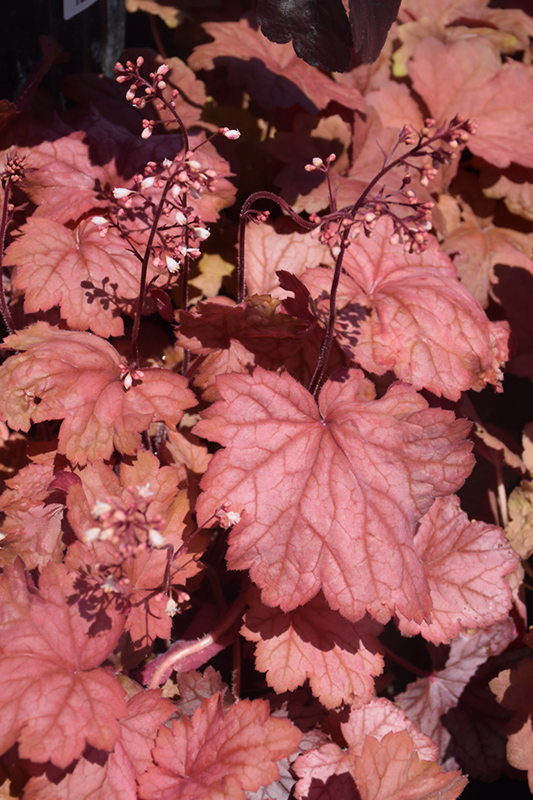 Georgia Peach Coral Bells features dainty spikes of creamy white bell-shaped flowers rising above the foliage from mid summer to early fall. Its attractive crinkled lobed leaves remain peach in color with curious purple undersides and tinges of silver throughout the year.